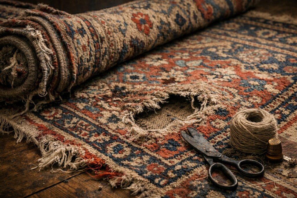 破れやほつれがあるジャンク品のペルシャ絨毯。修復素材としての価値と買取事例