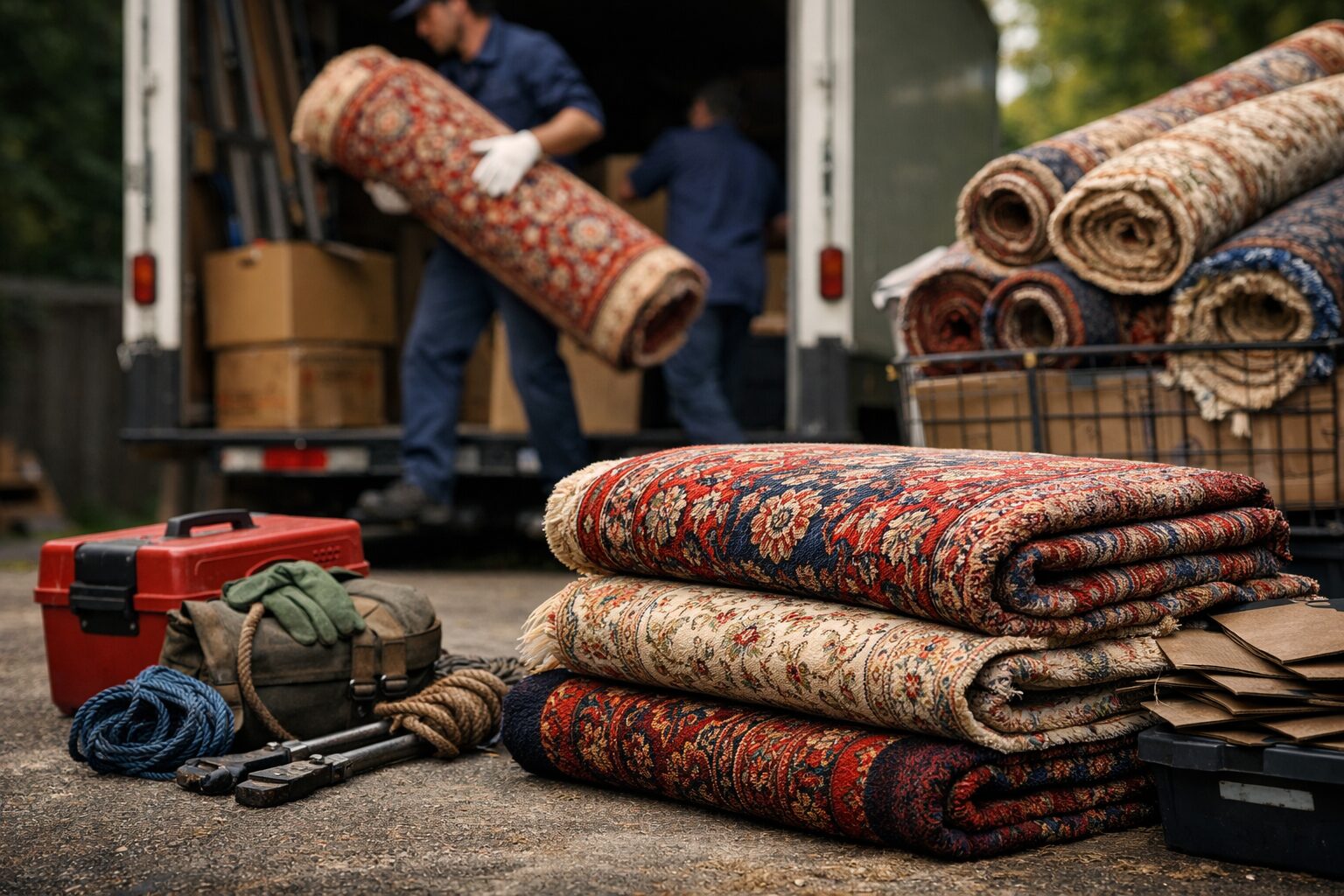 回収当日は、依頼主が立ち会いのもと、スタッフが部屋からペルシャ絨毯を運び出します。プロのスタッフであれば、床や壁を傷つけないよう養生を行ったり、スムーズな動線で搬出を行ったりしますので、作業時間は数分から十数分程度で完了することがほとんどです。